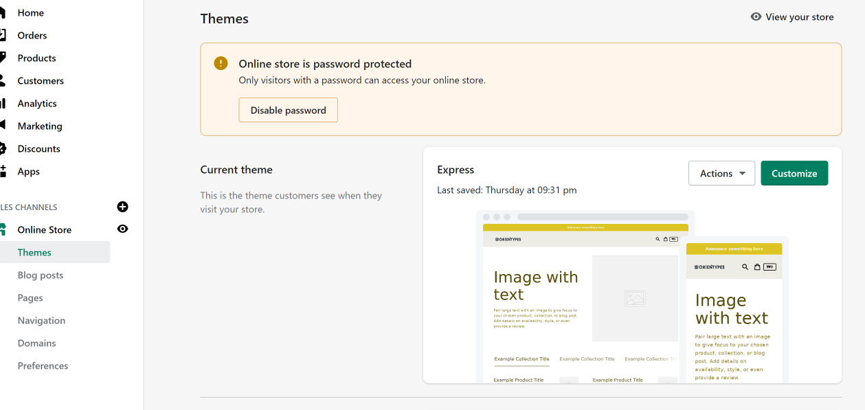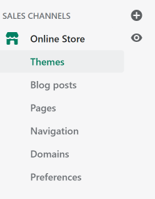 Online Store 영역은 주로 쇼핑몰 "형태"를 만드는 곳이고, 메뉴 우측에 눈 아이콘을 클릭하면 생성한 홈페이지가 새창뜨기로 나온다. 그 다음으로 Sales Channels 영역은 아무래도 홈페이지를 다 만든 후에 살펴봐도 좋을 듯하여 PASS~
