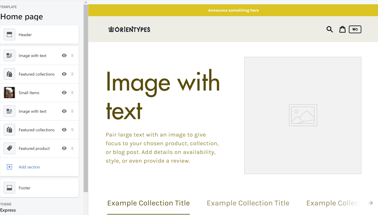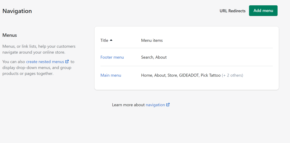 이 부분에서 어디에서나 보이게 되는 메인 메뉴를 만들 수 있다. 전문용어로는 "글로벌 네비게이션"이라고 할 수 있겠다. 그리고 위의 Home 영역에서 Products와 Collections와 함께 미리 페이지들을 만들어두어야, 메뉴에 연결할 수가 있다. 특정 페이지들이 없이는 Main menu에 메뉴들을 등록할 수 없었기 때문이다. 아래 만들어둔 메인 메뉴들은 임의로 페이지를 하나 만들어서 일단 모두 동일한 페이지에 연결하거나 Home을 연결해두었다.