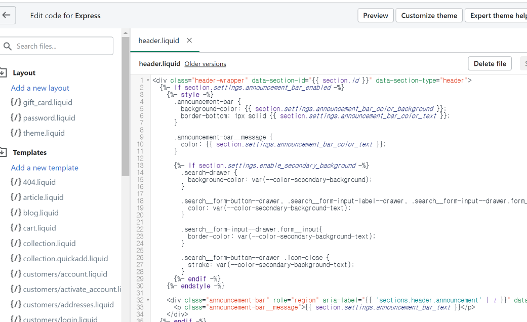 역시 좌측 하단에 Theme settings 다음으로 Theme actions가 있는데, 이를 클릭하면 상단의 좌측 이미지처럼 팝업이 뜬다. 이중에서 Edit code로 들어가서 좀더 전문적인 수정 작업이 가능하다. 내가 선택한 템플릿에는 소위 "글로벌 네비게이션"을 제공하지 않고 상품 콜렉션 메뉴만 보여주고 있는데, 이를 통해 메인 메뉴들을 노출되도록 고쳐볼 예정이다.