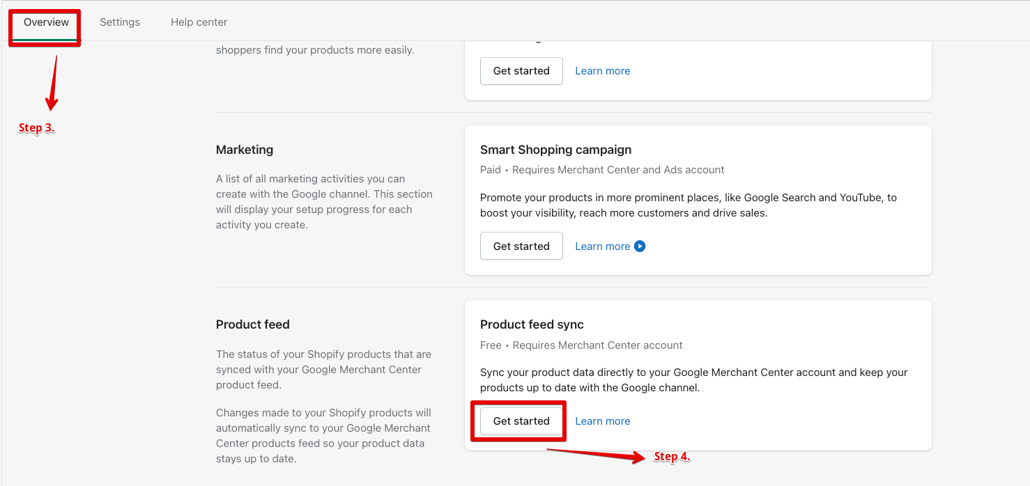 구글 채널의 Overview를 클릭하고 스크롤을 내리면 Product Feed섹션에서 Product Sync를 클릭(Get started)해줍니다. 이후 "타겟마켓"과 "배송 설정"에 대한 설정을 마치면 모든 연동이 끝납니다.