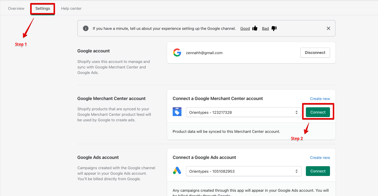 2. Google Merachant Center 섹션에서 Connect 클릭