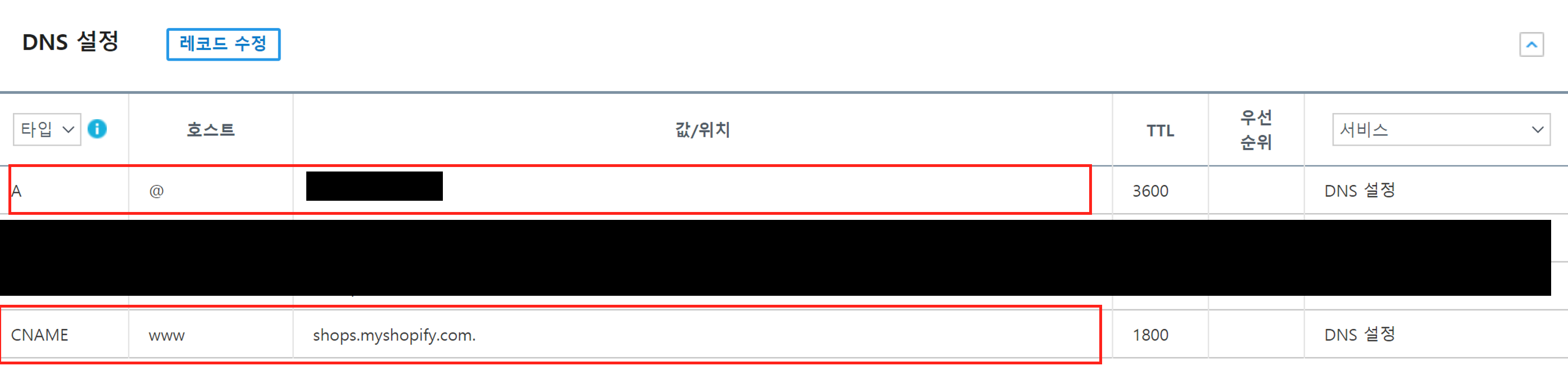 - CNAME 레코드는 shops.myshopify.com로 입력합니다.