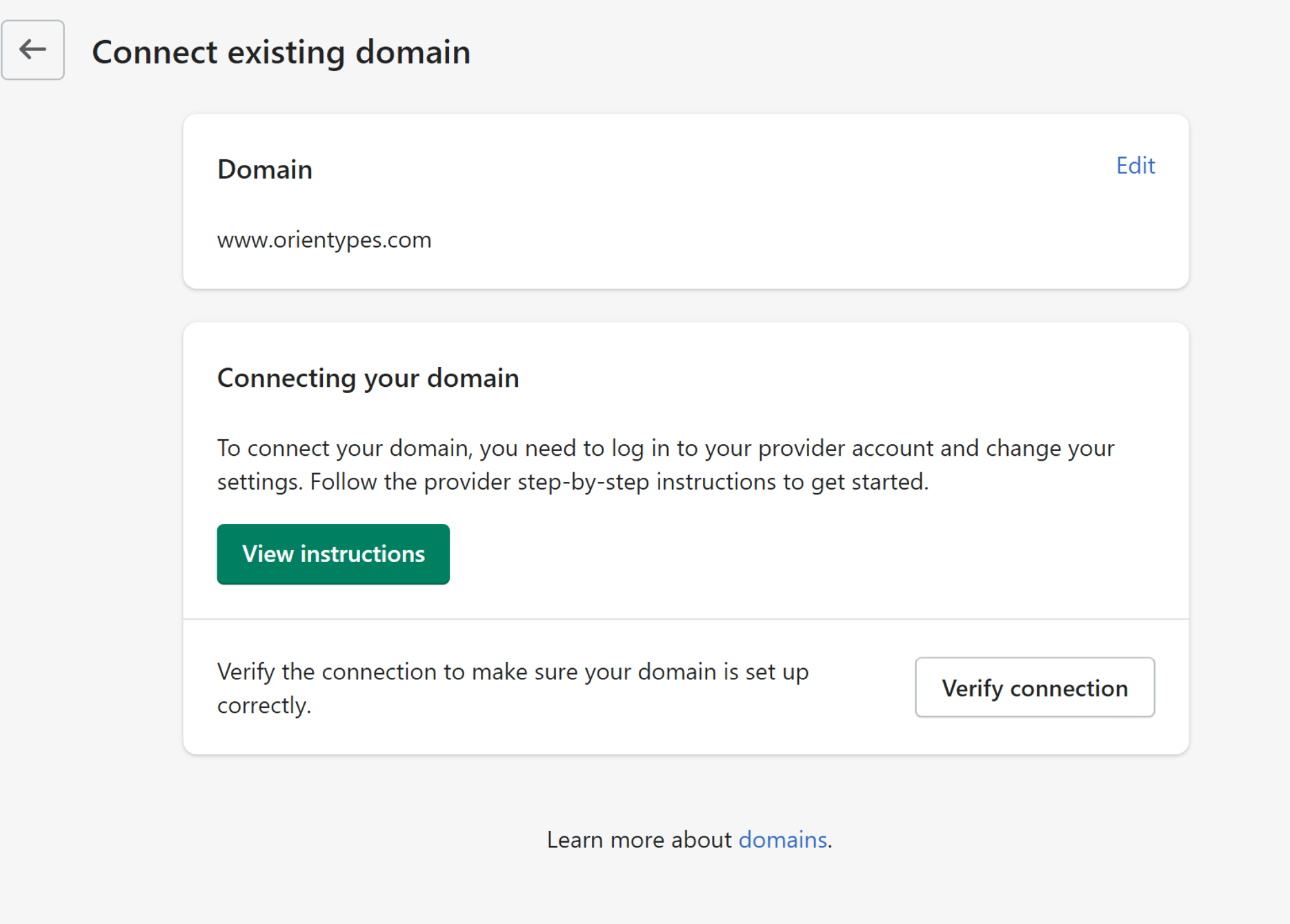 - A레코드의 쇼피파이 IP주소 : View instructions 페이지에서나 Verify connection 시도할 때 확인할 수 있는 정보