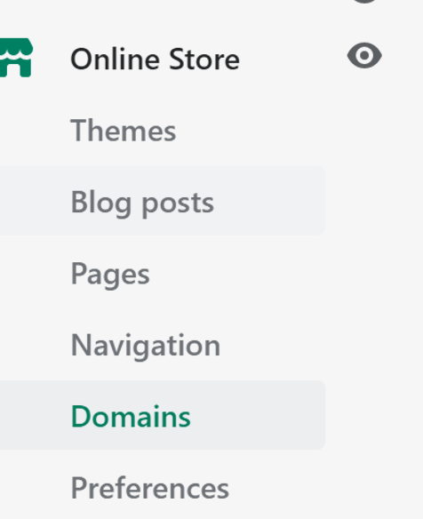 우선 도메인 연결하는 메뉴 위치는 아래와 같이 "Online Store"를 클릭하면 펼쳐치는 메뉴에 위치하고 있습니다. Domains 페이지에서 Connect exixting domain과 Transfer domain이라는 링크를 페이지 상단에서 찾을 수 있죠.