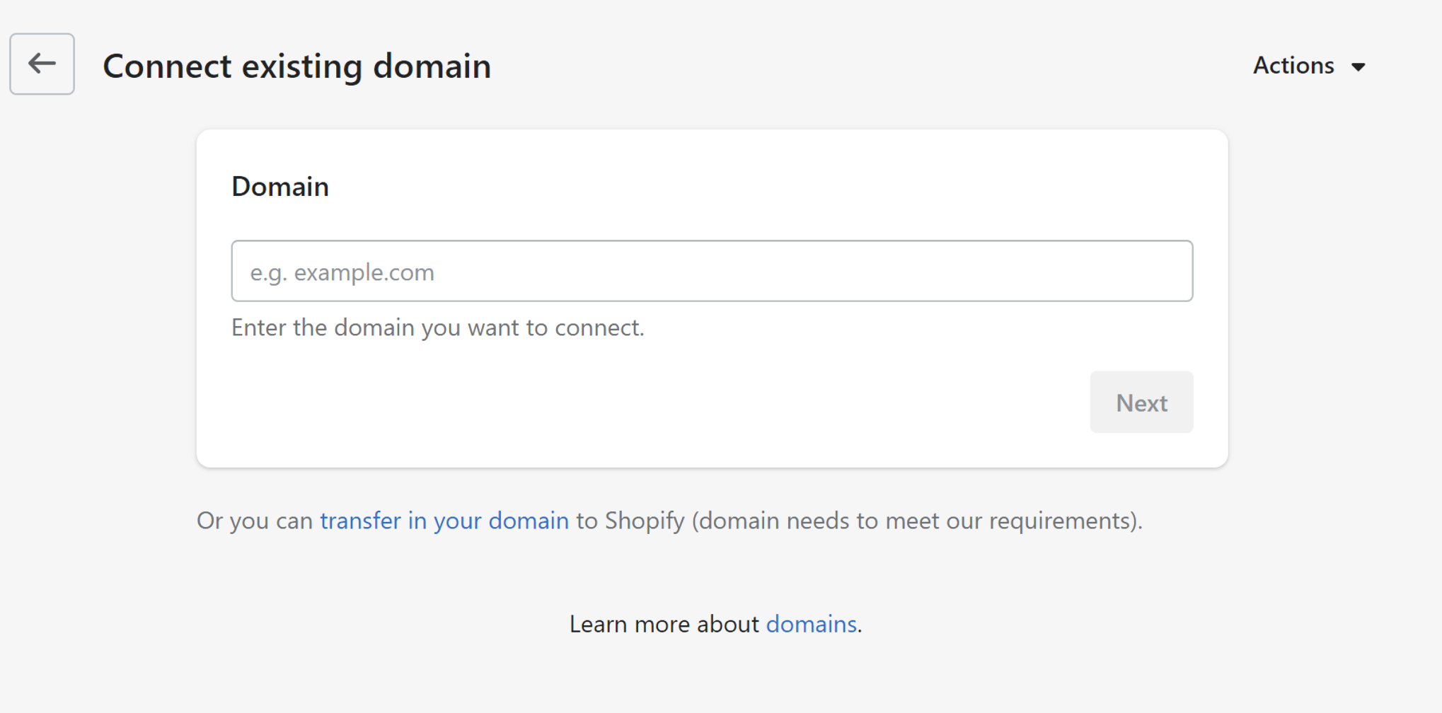 저는 기존에 www.orientypes.com이라는 도메인을 갖고 있기에 Connect exixting domain를 이용했습니다. Transfer domain는 도메인 관리를 쇼피파이로 이전하는 기능으로, 왠지 번거로울 것같아서 기존에 사용하고 있던 가비아에서 관리를 계속하기로 했습니다. 아래에 우측 이미지인 Connect exixting domain 페이지에서 각자 보유하고 있는 도메인을 넣어줍니다. 그리고 Next 버튼을 눌러줍니다.