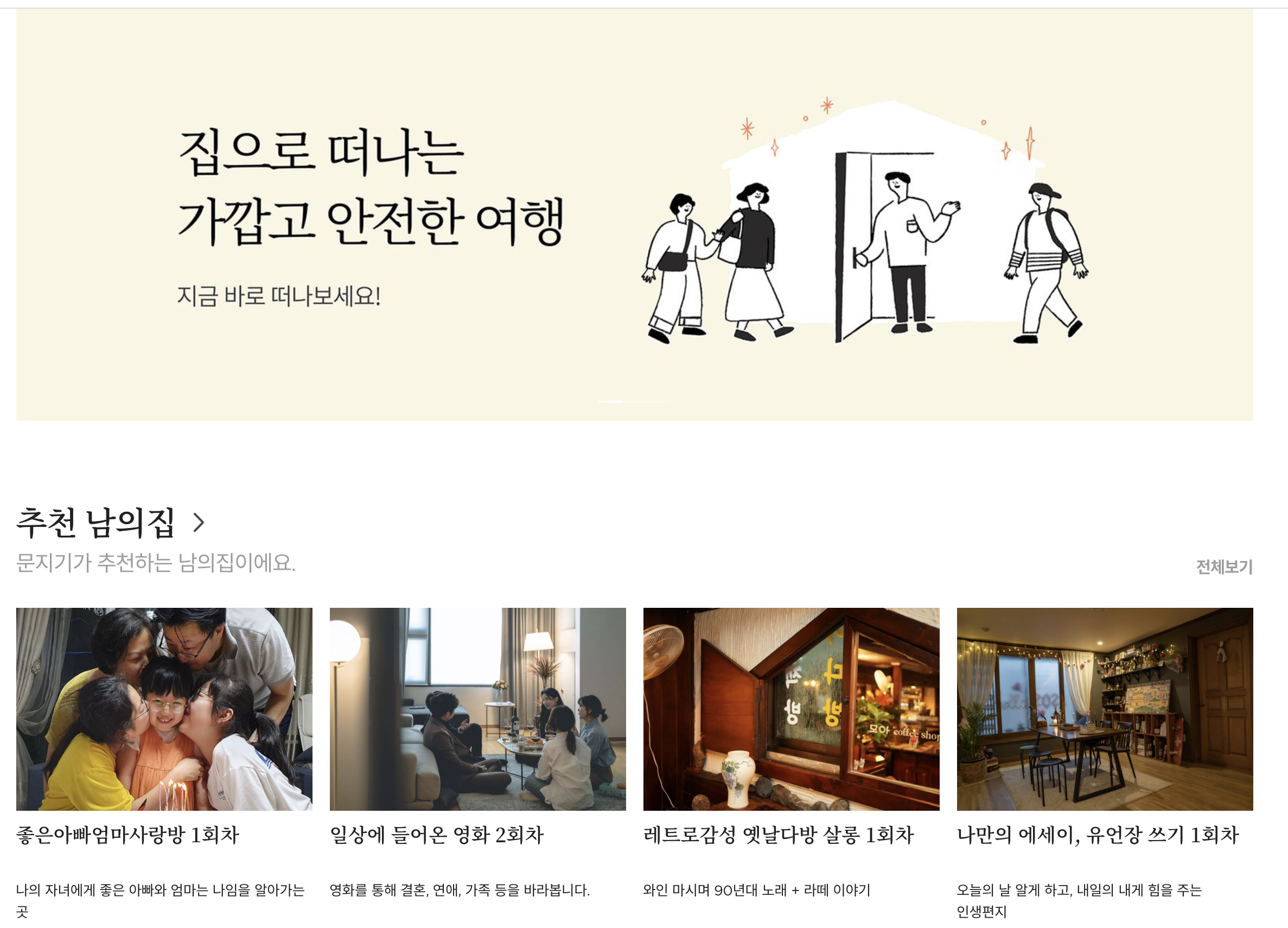 "집에서 취향을 나누는 여행 서비스"로 삶의 터전이자 보금자리인 누군가의 집이 취향을 나누는 즐거운 여행지가 되고, 결이 맞는 사람들과 비슷한 취향을 나누고 새로운 취향을 발견하는 재미, 낯설지만 특별한 경험을 제공한다. 나도 여행을 좋아하는 사람의 입장으로 보자면, 사실 그 낯설음에 대한 호기심 충족이나 남은 어떻게 사나에 대한 궁금증 해소 등이 여행 속에는 숨어있다고 생각한다. 그러한 점에서 보면 남의집은 꽤나 엣지 있는 서비스이다.