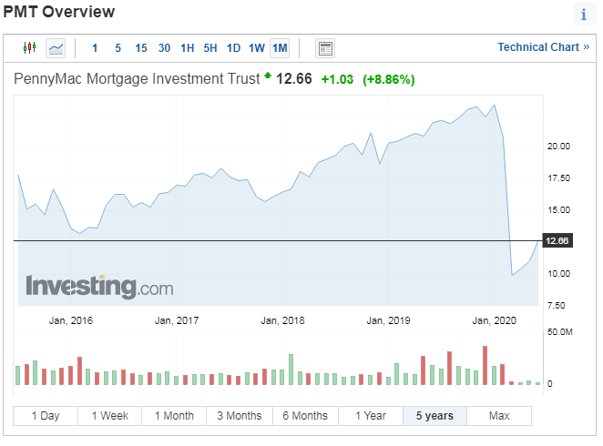 페니맥 모기지 인베스트먼트 트러스트, 부동산 담보 대출사업을 하고 있는 모기지 리츠 회사로 최근 코로나로 큰 변동성을 겪었습니다. 하지만 PMTb 같은 우선주들은 최저점에서 4배 가까운 상승 흐름을 보이고 있습니다. 우선주에 먼저 크게 상승했으니, 이번에는 보통주가 상승할 차례가 아닐까요? 참고로 8% 정도의 고배당을 지급합니다.