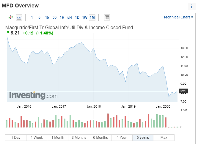 맥쿼리 글로벌 인프라스트럭쳐 펀드(MGU)와 맥쿼리 퍼스트 트러스트 글로벌 인프라스트럭쳐 유틸리티 배당 인컴 펀드(MFD)라는 것이 있습니다. 일단 이름들이 참 기네요. 이들은 모두 10% 이상의 고배당을 주는 펀드들입니다. 다만 주가 자체의 변동성이 크거나 꾸준히 하락하는 형태의 주식임을 염두에 둬야할 것같습니다.