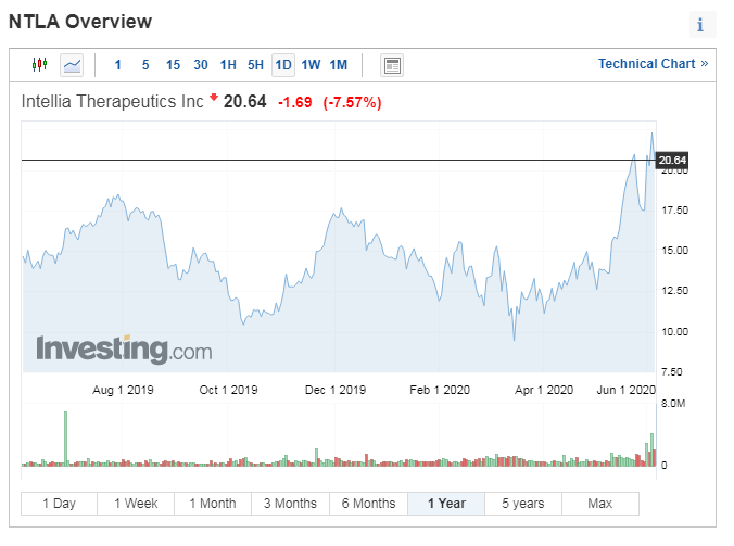 인텔리아 테라퓨틱스는 하루에 10%이상 주가가 상승하면서, 지난 세션에서 큰 인기를 끌었다. 이 움직임은 일반적인 세션에서보다 더 많은 손바뀜으로 견고한 규모로 또한 이루어졌다. 이는 최근 한달 동안 74.3%이나 주가가 상승하면서 상승세가 이어지고 있다.