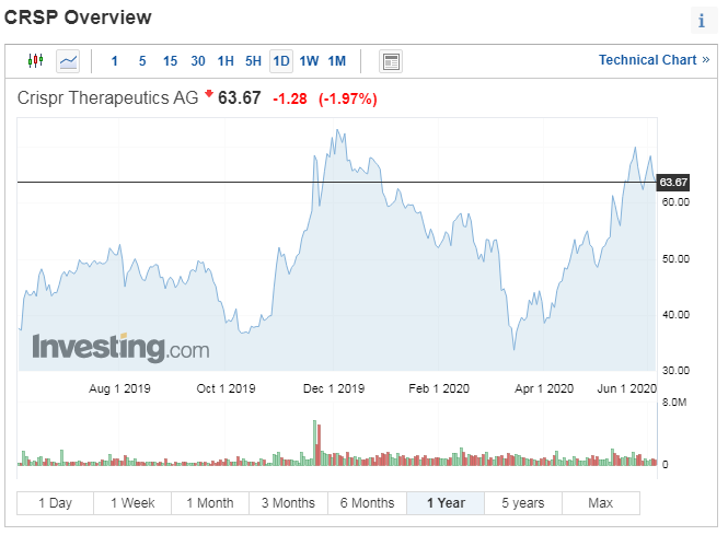 오늘 소개하려는 3개의 기업들은 모두 매우 트랜드한 기업들입니다. 이중에서 비교적 적자폭이 적거나 수익을 어쩌면 내고 있는 기업은 크리스퍼 테라퓨틱스(CRISPR Therapeutics)입니다. 그래서인지 이 섹터에서는 대장주이고 가장 크게 올랐다고 합니다. 음... 왜 항상 저를 비껴갈까요?