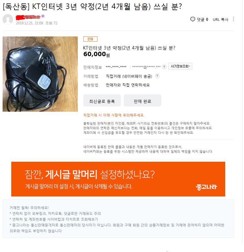 그런데 몇개월 지나고 보니, 시간도 생각보다 빨리 지나가고 있는 것 같았고, 1년이 지난 시점에서도 여전히 새삼 다시 인터넷을 사용하게 될 것 같지도 않아서, 아래처럼 돈 6만 원을 줄 테니, 2년 4개월 남은 3년 약정 인터넷 약정의 KT 인터넷 서비스를 쓰실 분을 찾는 페이지를 중고나라와 당근마켓에 올렸었습니다.